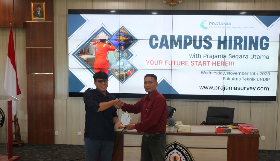 Tepat sehari setelah acara wisuda ke-172 Universitas Diponegoro, Departemen Teknik Geodesi mengadakan acara kuliah umum dan Campus Hiring oleh PT. Prajania Segara Utama di Ruang Teater lantai 4 Dekanat Fakultas Teknik Universitas Diponegoro. Tujuan utama kegiatan tersebut tentu saja untuk memberikan gambaran perkembangan IPTEK hidrografi dan oseanografi terkini, dan memfasilitasi rekrutmen sarjana teknik geodesi fresh graduate untuk berkiprah di dunia maritim, khususnya dalam eksplorasi minyak dan gas bumi di lepas pantai.